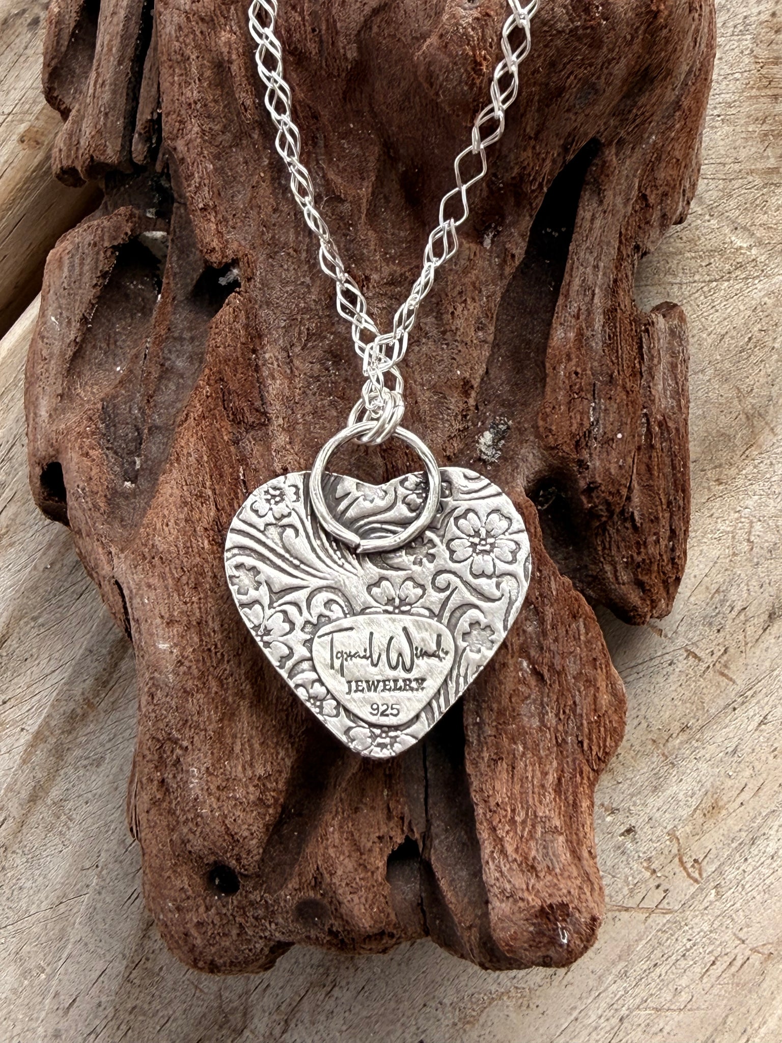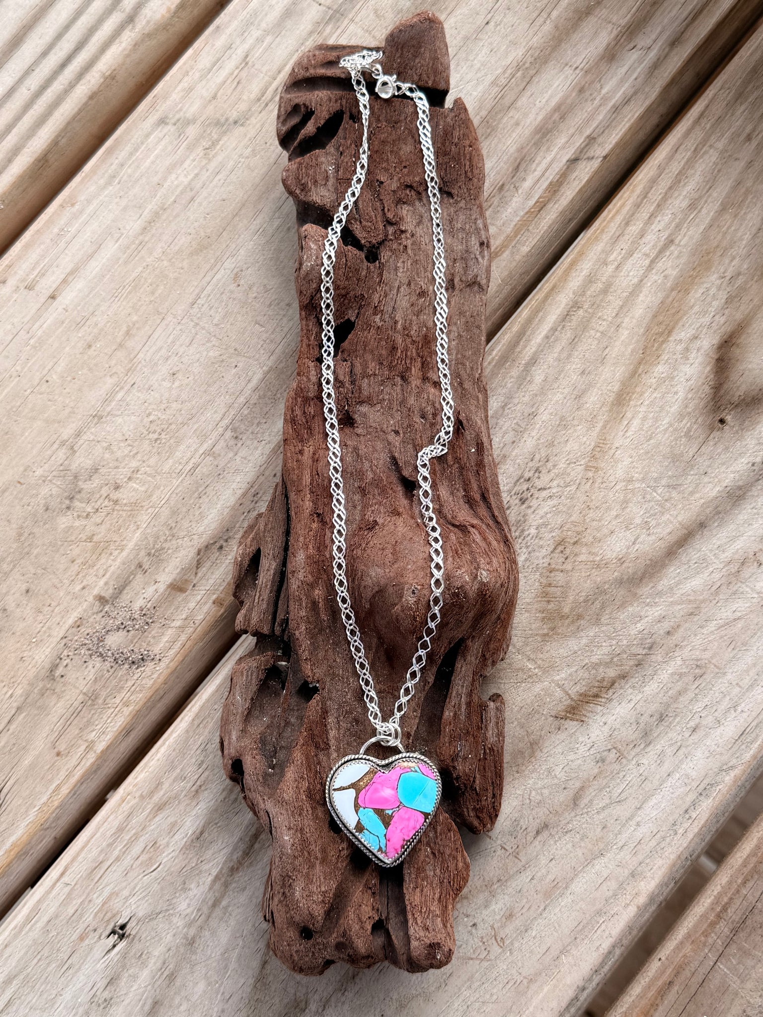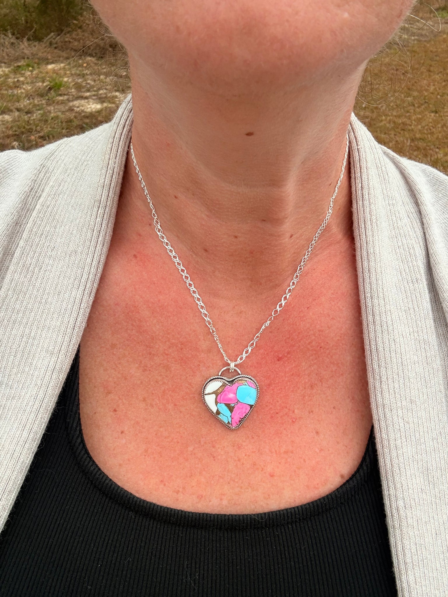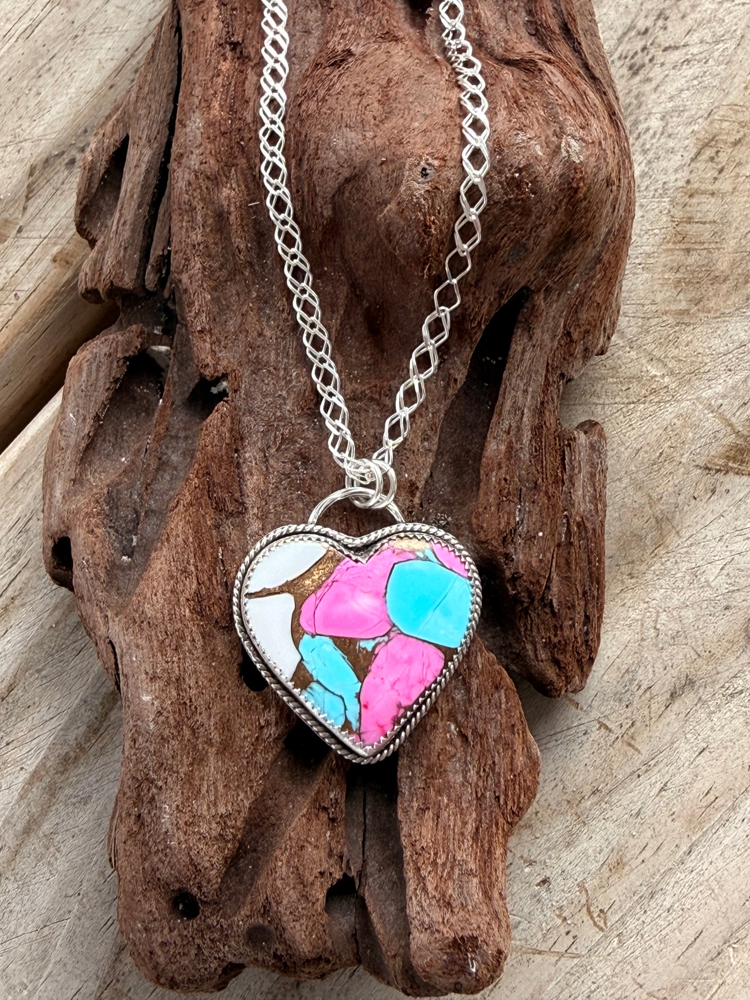 Handcrafted cotton candy turquoise heart necklace on a 18" sterling silver chain. All handmade by me using .925 sterling and .999 fine silver.