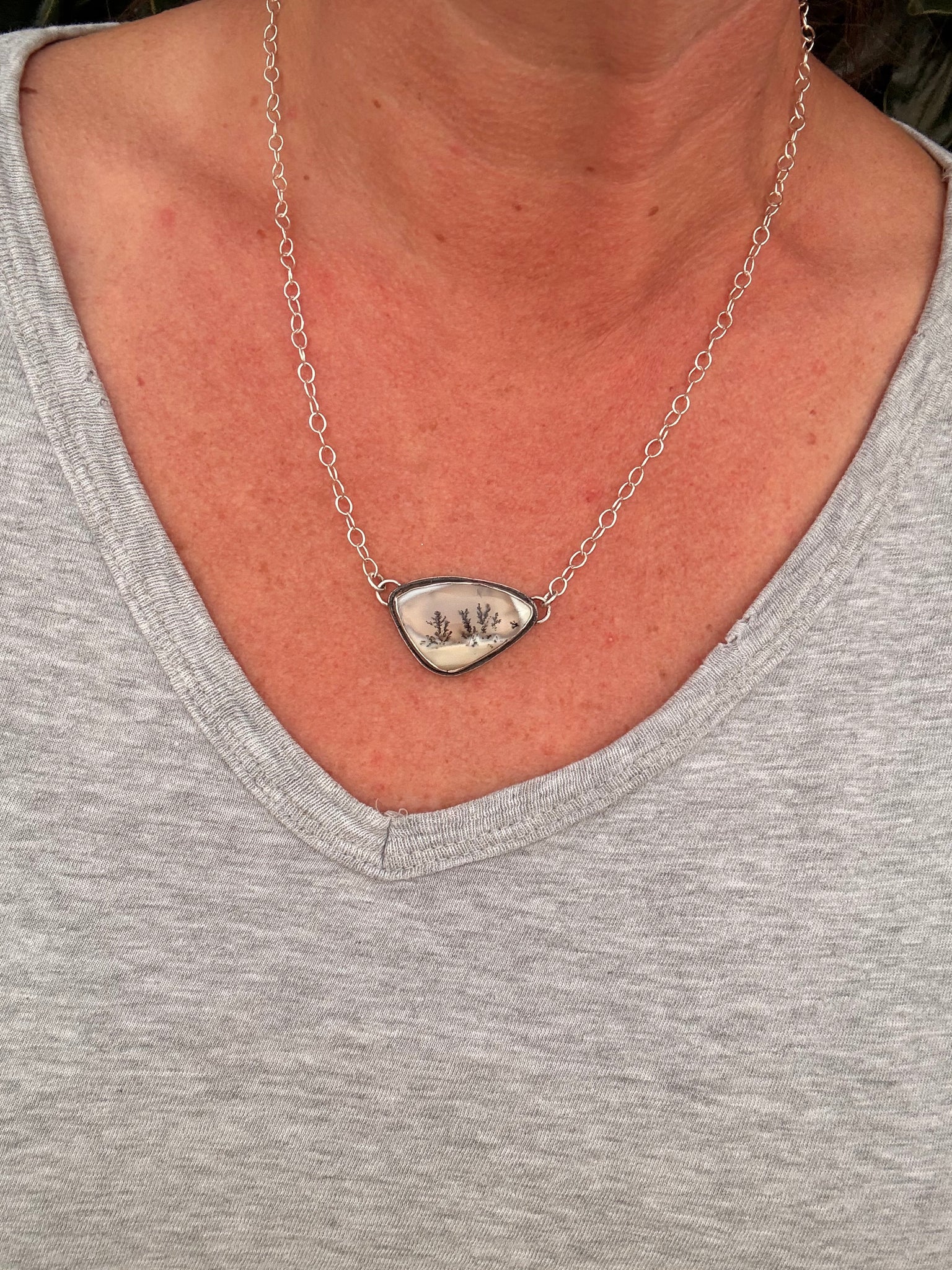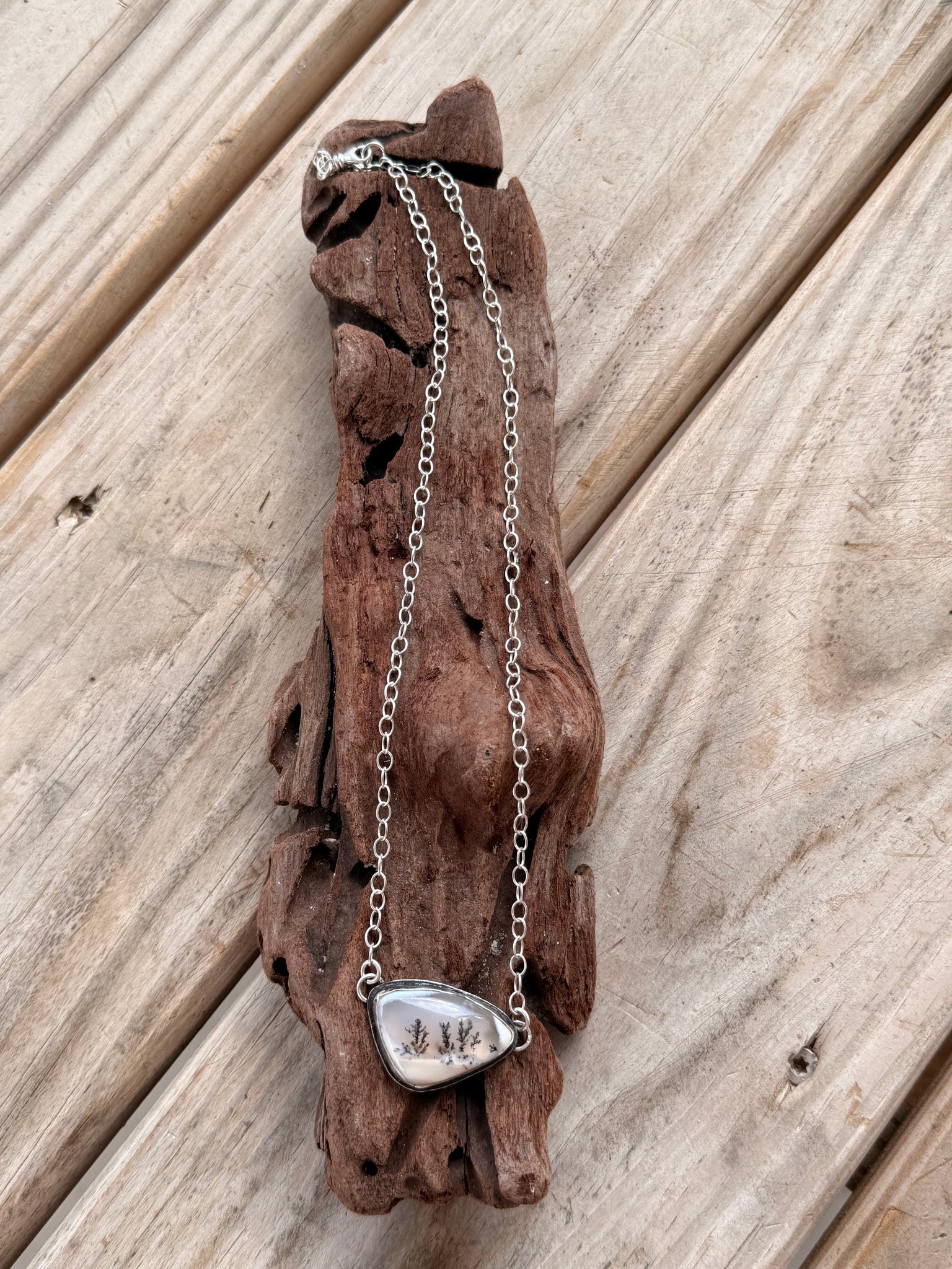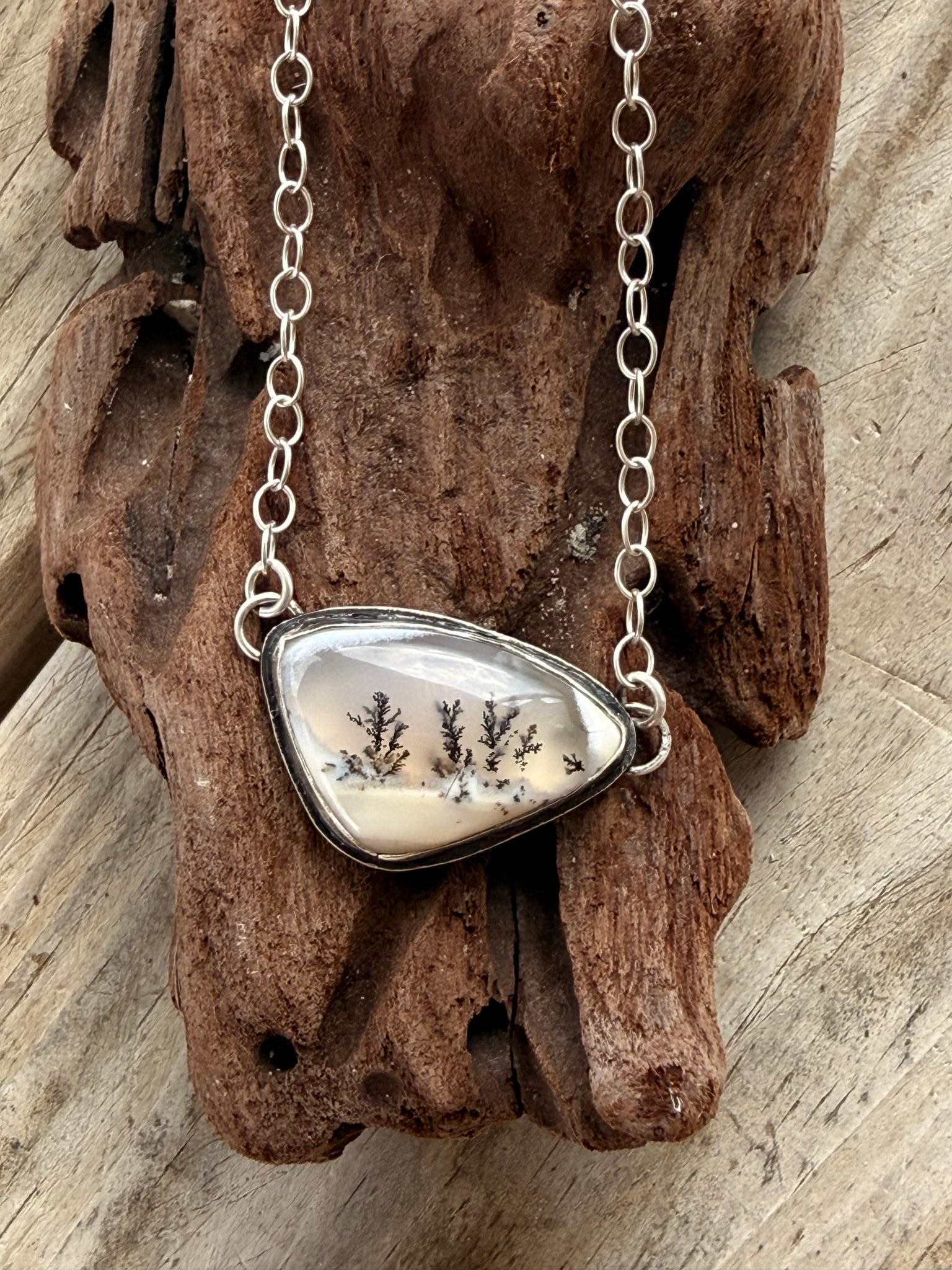 Dendritic Opal necklace measures 20 1/2" long on sterling silver chain. All handmade by me using .925 sterling and .999 fine silver.
