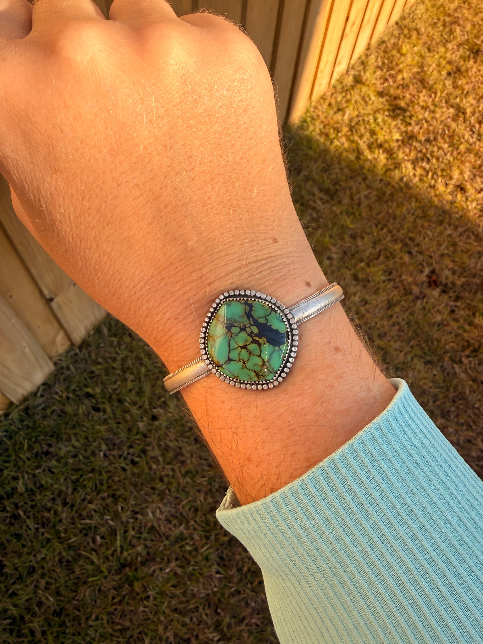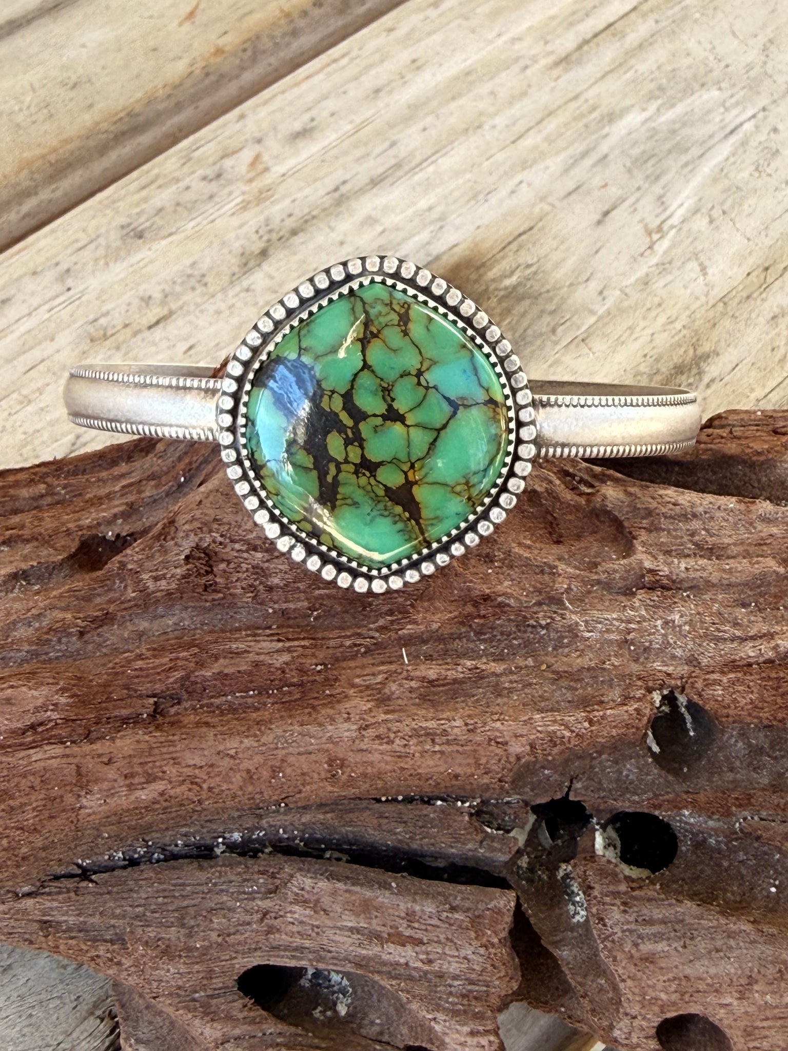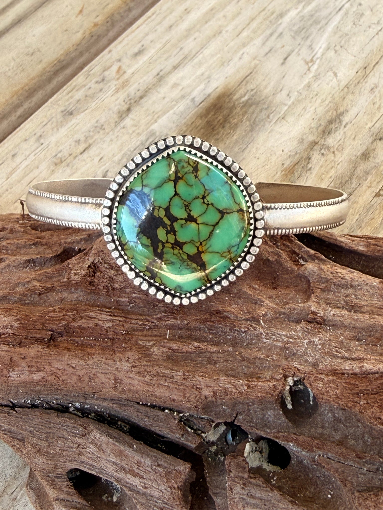 Handmade sterling silver Hubei Turquoise cuff bracelet.