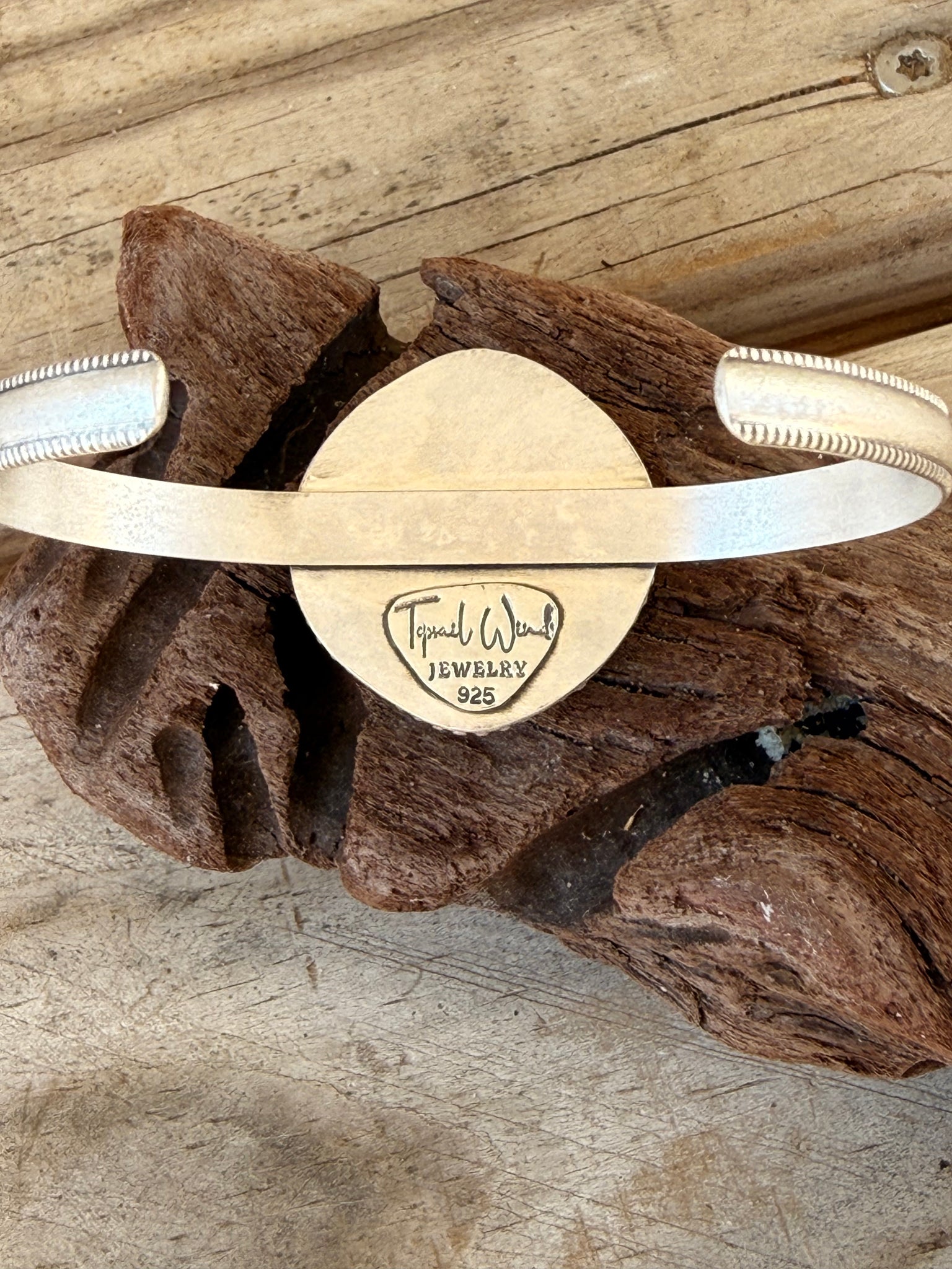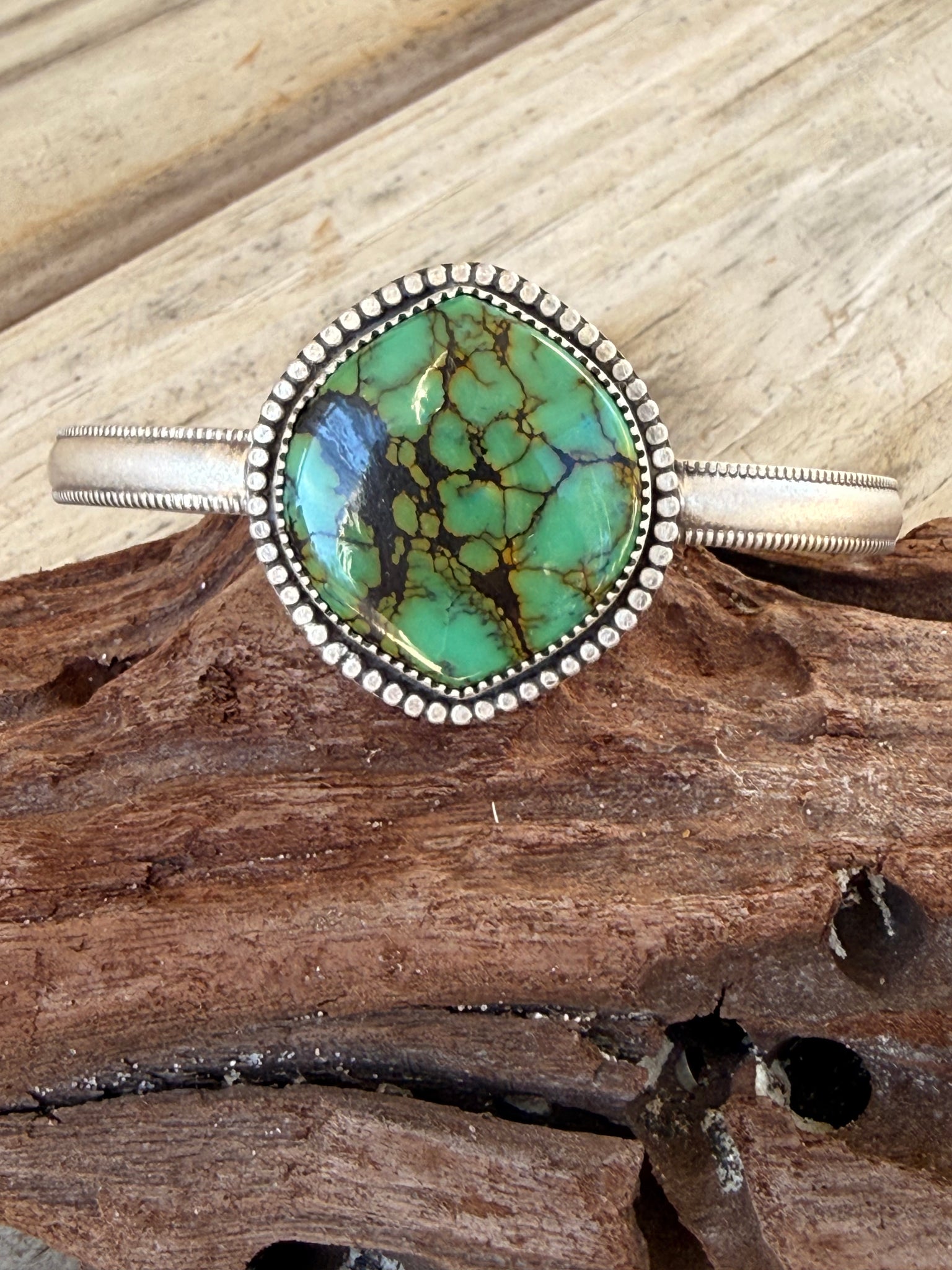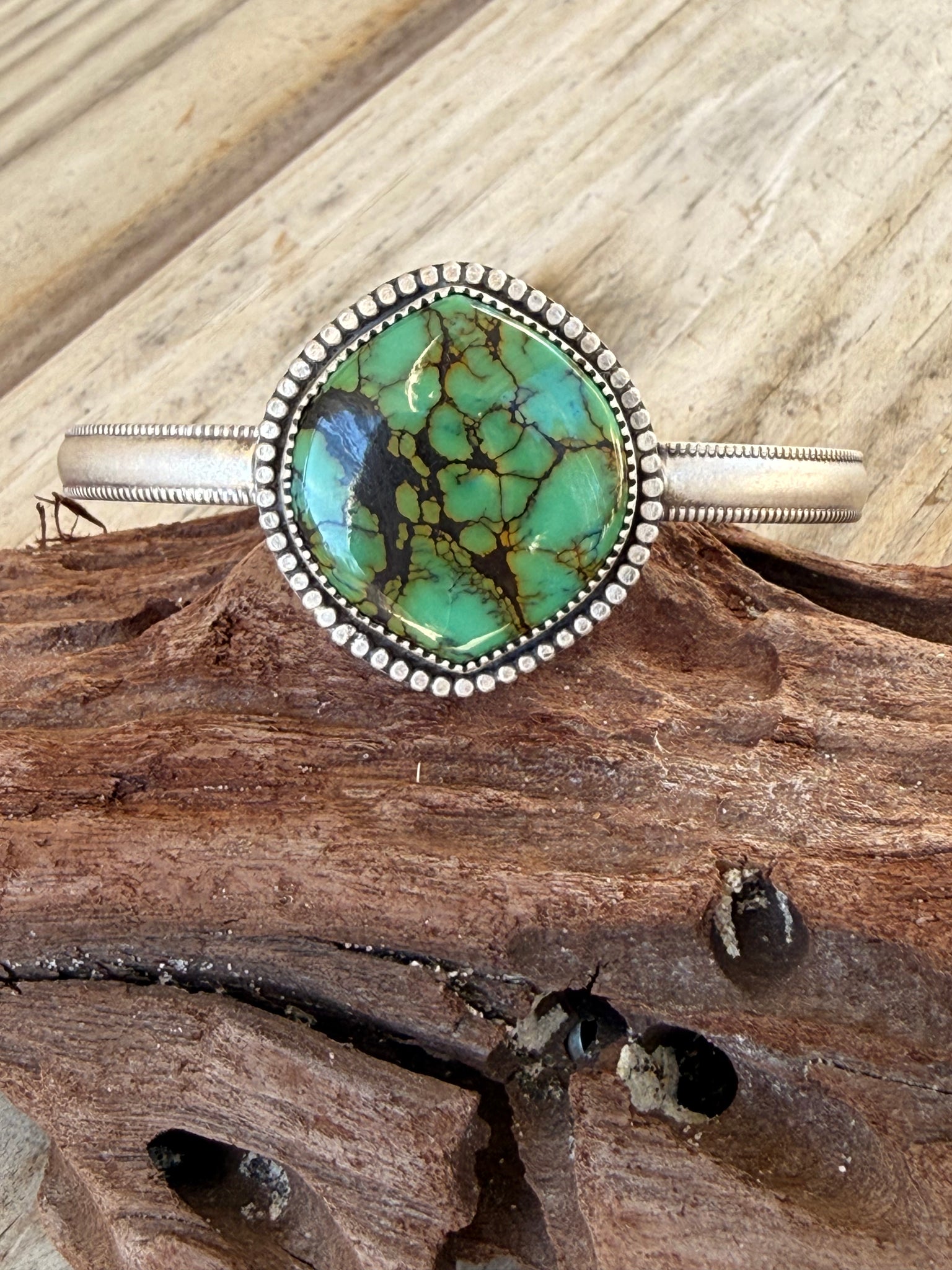 Handmade sterling silver Hubei Turquoise cuff bracelet.