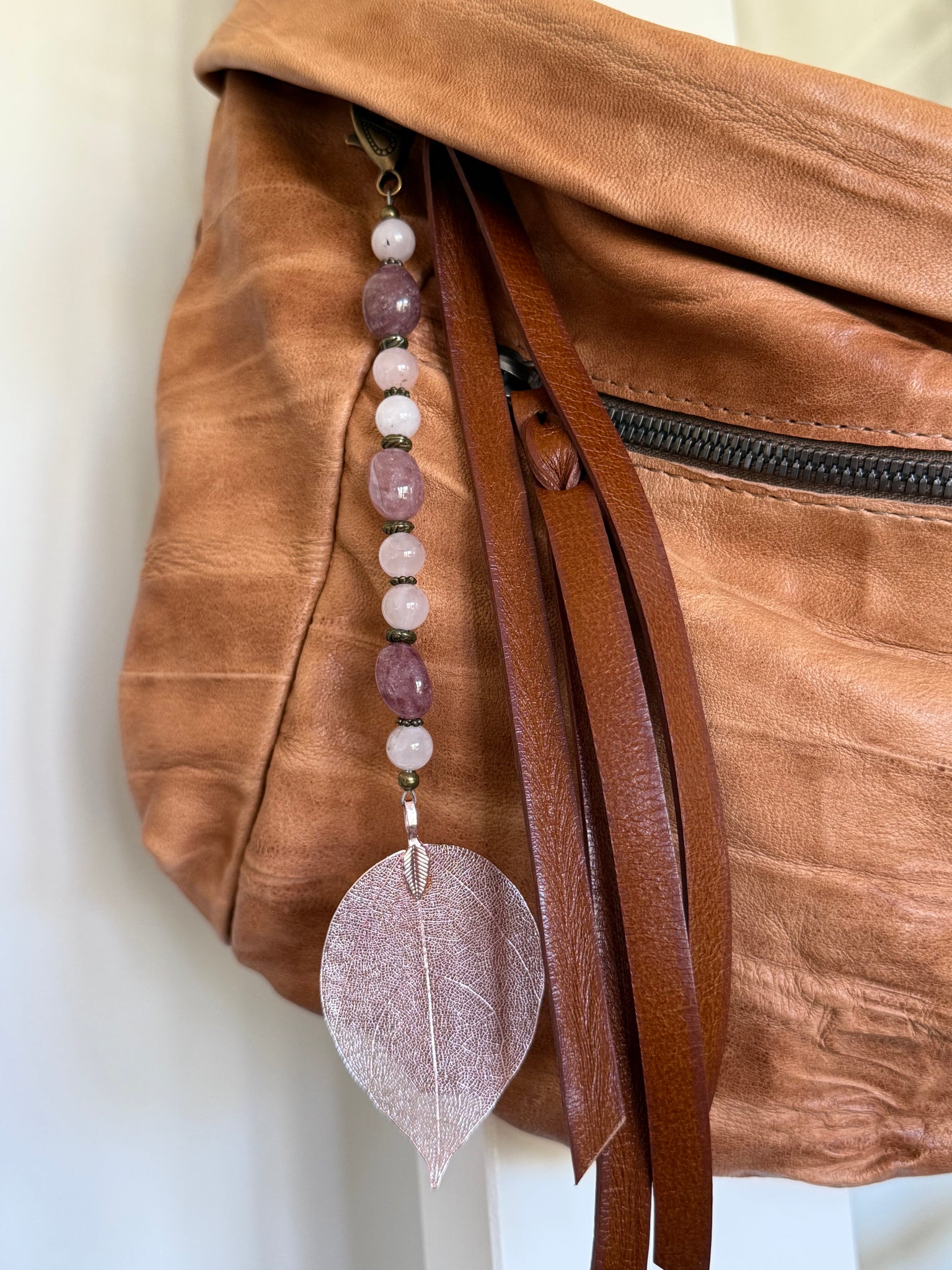 This stunning bag charm features a stunning electroplated leaf pendant and gemstone beads.